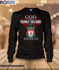 The phrase God First Family Second Then Liverpool Football Shirt signifies the importance of one’s priorities in life. It highlights the belief in putting one’s faith in God above all else, followed by the importance of family relationships. The reference to Liverpool Football Shirt could symbolize one’s passion or loyalty to a particular sports team. Overall, the phrase conveys a message about the significance of spiritual and personal connections alongside one’s interests and hobbies.