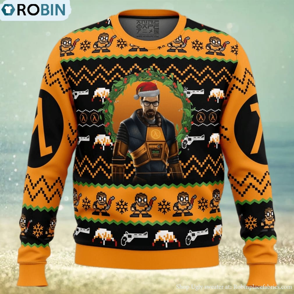 Celebrate the holiday season in style with this unique Christmas sweater inspired by the iconic video game character, Gordon Freeman. Featuring a festive design with snowflakes, Santa hats, and other holiday symbols, this sweater is perfect for any gaming enthusiast. The sweater is made from comfortable and high-quality materials, ensuring a cozy fit throughout the winter season. With its fun and nostalgic design, this sweater is sure to be a hit at any Christmas party or holiday gathering. Spread some holiday cheer and show off your love for the Half Life franchise with this one-of-a-kind ugly Christmas sweater.
