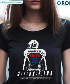 The Goshen Smith 32 Football Leave It All Out On The Field Shirt is a testament to the dedication and passion of football players. It represents the relentless pursuit of greatness, the drive to push through challenges, and the commitment to leaving everything on the field. Crafted with high-quality materials, this shirt offers both style and comfort. With its elegant design and powerful message, it serves as a reminder to never back down and always put in 100% effort, both on and off the football field.