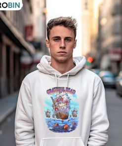The Grateful Dead 1993 Ship of Fools Artwork by Rich Normandin T-Shirt is a fan favorite piece of merchandise representing the band's 1993 album, Built to Last. These tie-dye inspired shirts proudly feature a custom design from Rhode Island artist, Rich Normandin. This eye catching design features a single skull sailing a wooden vessel across a troubled sea of clay and stone jagged islands – a fitting image for the album's sailing-inspired title and reflective lyrics. With its uplifting beach motif and air of adventure, this T-shirt allows Grateful Dead fans to show off their appreciation for the band's music while looking stylish. Comfortably lightweight and made from 100% cotton, this shirt is suitable for everything from concerts to casual outdoor activities and everyday errands.