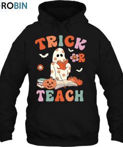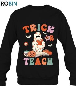 Groovy Halloween Trick Or Teach Retro Floral Ghost Teacher Shirt details