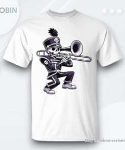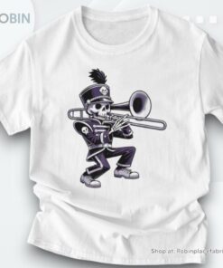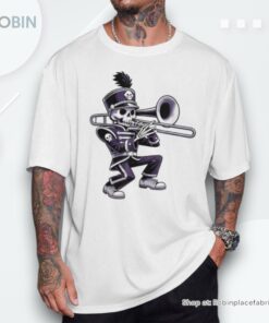 Unleash the ultimate blend of spooky and whimsical fashion with this uniquely designed shirt that captures the spirit of Halloween and the joyful rhythm of a school marching band, all through the lens of a skeletal trombone player. Perfect for Halloween festivities, music lovers, and anyone eager to make a statement this season, this shirt is more than just an outfit—it's a conversation starter. Crafted with intricate details and vibrant prints, it promises to add a hauntingly fun twist to your wardrobe. So why be ordinary when you can march to the beat of your own bone-rattling trombone?
