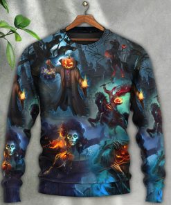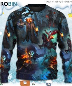 The Halloween season is upon us, and the atmosphere is filled with an eerie ambiance. The sky at night is adorned with the darkness that complements the spooky season. Within this haunting night, a vibrant and eye-catching Christmas ugly sweater sweatshirt stands out. The sweater features a design of a skull carved into a pumpkin, symbolizing the fusion of Halloween and Christmas festivities. The sweater is both scary and festive, making it the perfect attire choice for those who want to embrace the spirit of the season.
