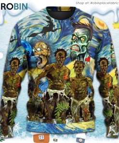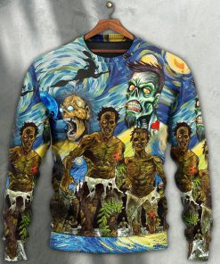 Halloween Zombie Crazy Starry Night Funny Boo Art Style Christmas Ugly Sweater, Sweatshirt details