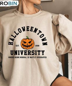 Sweatshirt This Halloween Town Pumpkin shirt from Halloweentown University is the perfect way to show off your Halloween spirit. The vibrant orange pumpkin design is printed on a comfy and cozy crewneck for an added touch of spooky style. The long sleeves will keep you warm and comfortable while you express your festive side. Plus, this sweatshirt features a Halloween Town University logo in white on the right sleeve for an extra special touch. So, whether you’re trick-or-treating, attending a Halloween party or simply chillin’ at home, this crewneck will show everyone just how much you love the spookiest time of the year.