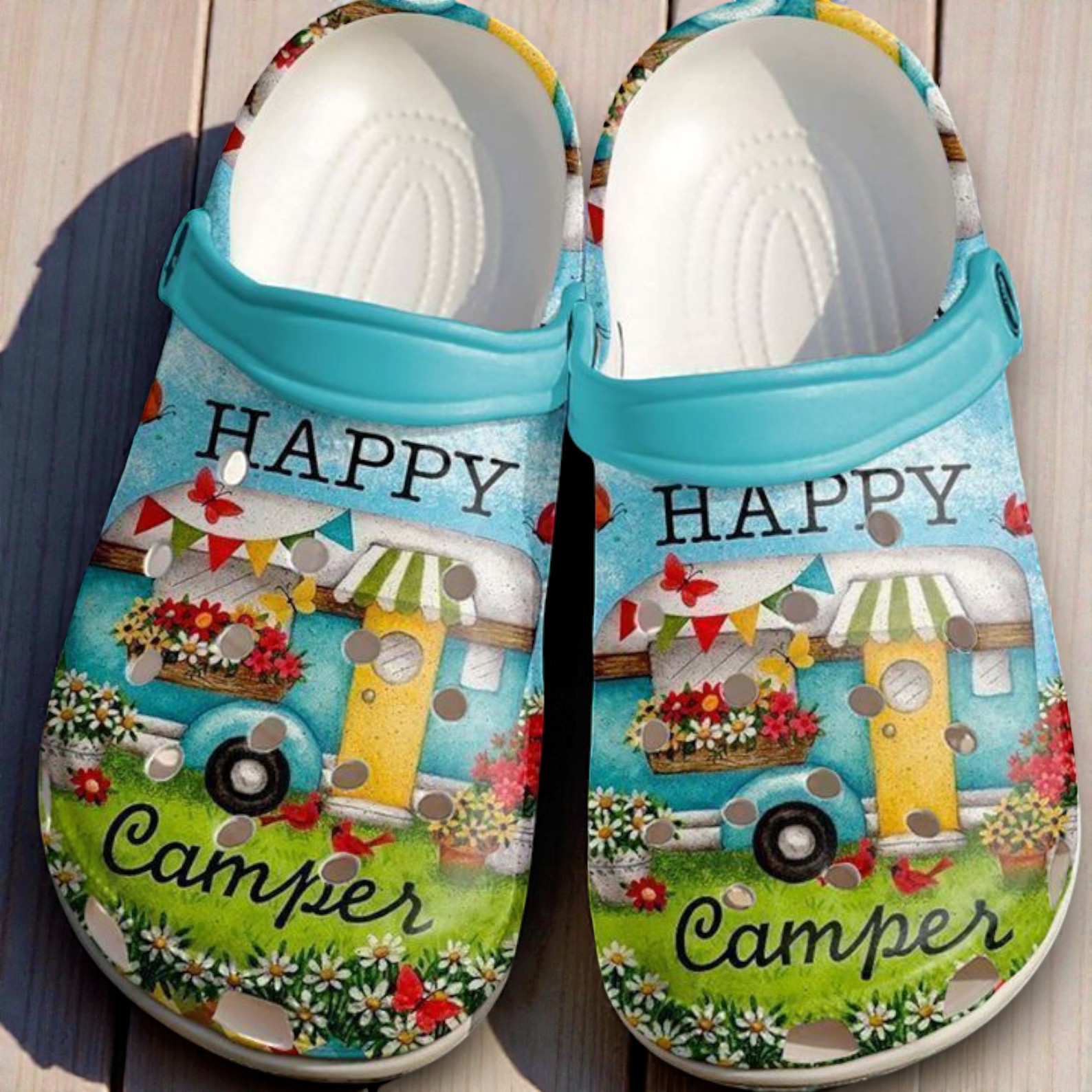 These custom Crocs capture the pure joy of the open road and sunny days at the campsite. The design features a charming, vintage-style travel trailer painted in cheerful shades of sky blue and sunshine yellow, complete with a striped green awning and window boxes overflowing with flowers.