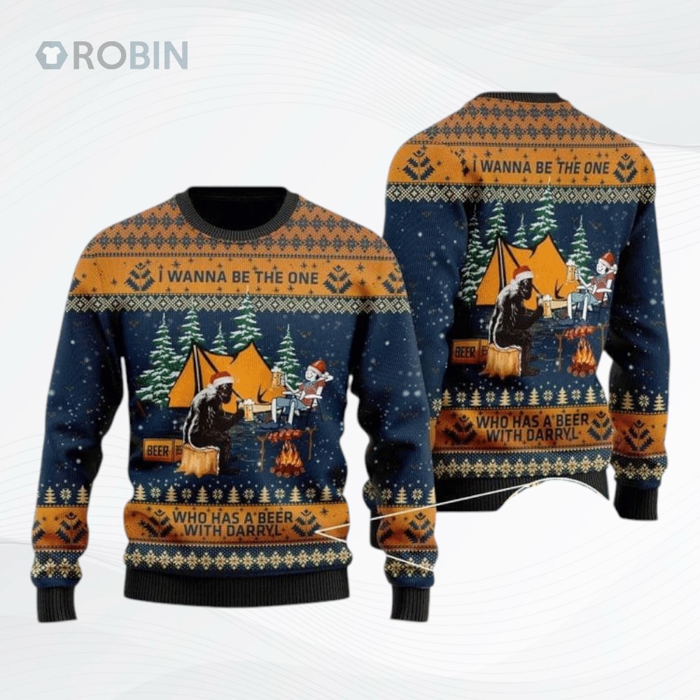 Gather around the campfire with Darryl and Bigfoot, sharing a festive brew in this quirky Christmas sweater. The playful design features a cozy camping scene complete with snowflakes and holiday cheer. Perfect for adding a dash of humor to your holiday wardrobe, it captures the essence of a lighthearted winter adventure. Ideal for any ugly Christmas sweater party or casual get-together.
