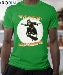 This funny streetwear shirt is the perfect way to show off your style. It features a unique and colorful graphic of a skeleton with a goofy expression, paired with text that reads 'Have The Day You Deserve'. The lightweight and comfortable fabric is perfect for casual wear, and the bright colors make it stand out. Whether you're walking down the street or hanging out with friends, this shirt will make a bold statement. The relaxed fit is comfortable and keeps you cool in the heat. Pair this tee with a pair of jeans for a casual look, or dress it up with a pair of dress pants for more formal occasions. With its fun design, this streetwear shirt is sure to be an eye-catching piece.