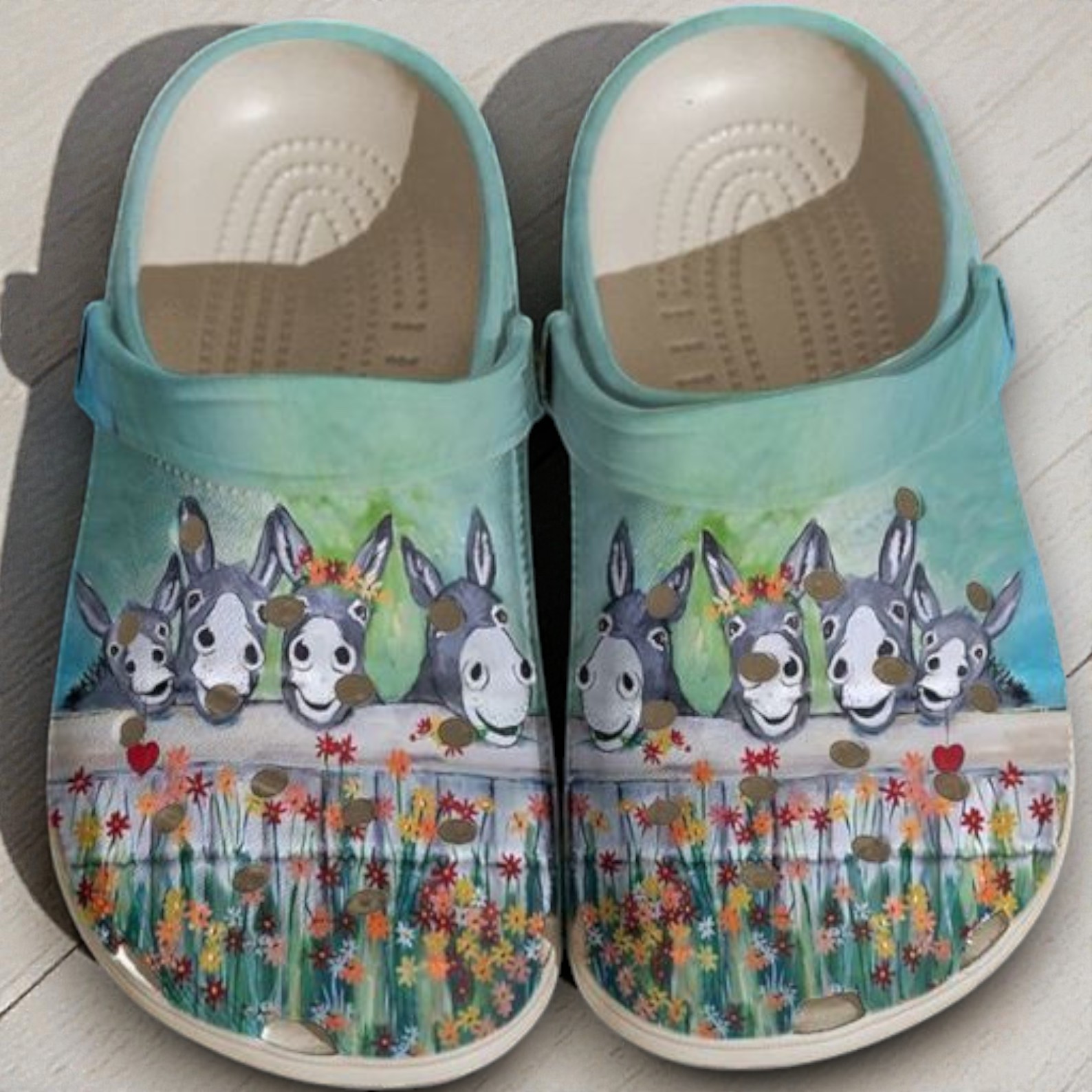 These custom Crocs capture the lighter side of farm life with a delightful, painterly design. The scene features a row of five curious donkeys (or burros) peeking their heads over a white wooden picket fence to say hello. Each donkey has a unique, goofy expression, and some are even accessorized—one wears a festive orange flower crown, while another sweetly holds a red heart in its mouth.