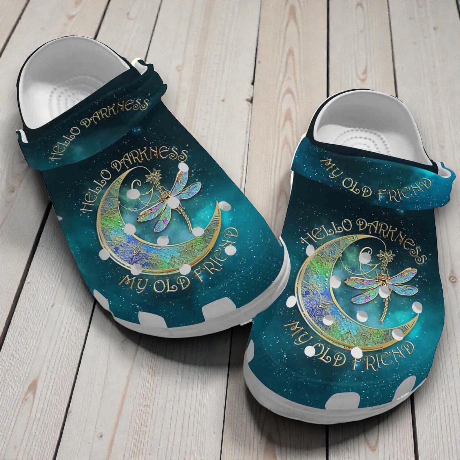 This custom design combines a touch of mystery with beautiful night-time art. The shoes feature a deep teal background that looks like a starry night sky, highlighted by an ornate crescent moon and a delicate dragonfly. The classic phrase "Hello Darkness My Old Friend" is written in elegant gold text, adding a unique and meaningful touch.