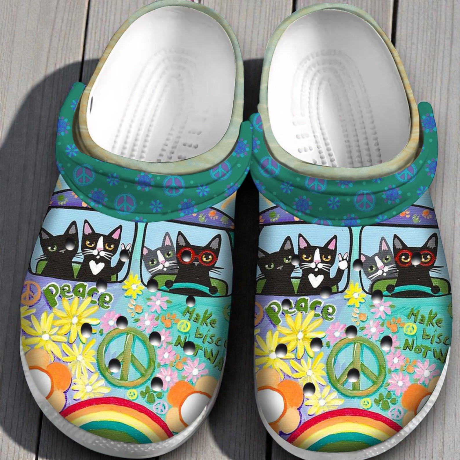Peace, love, and… biscuits? These colorful Crocs are all about good vibes. The design features a group of cool black and white cats riding along in a retro blue van, looking ready for a road trip.