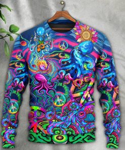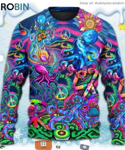Get ready to spread some holiday cheer with this vibrant and playful ugly Christmas sweater! Inspired by the free-spirited hippie culture, this sweater showcases a delightful octopus design in a mesmerizing tie-dye pattern. The multitude of colors on this sweater will surely catch everyone’s attention at your next Christmas gathering. With its quirky and humorous vibe, it’s bound to bring smiles and laughter to all who see it. This sweater is the perfect choice for those who love to stand out and embrace their unique sense of style during the festive season.