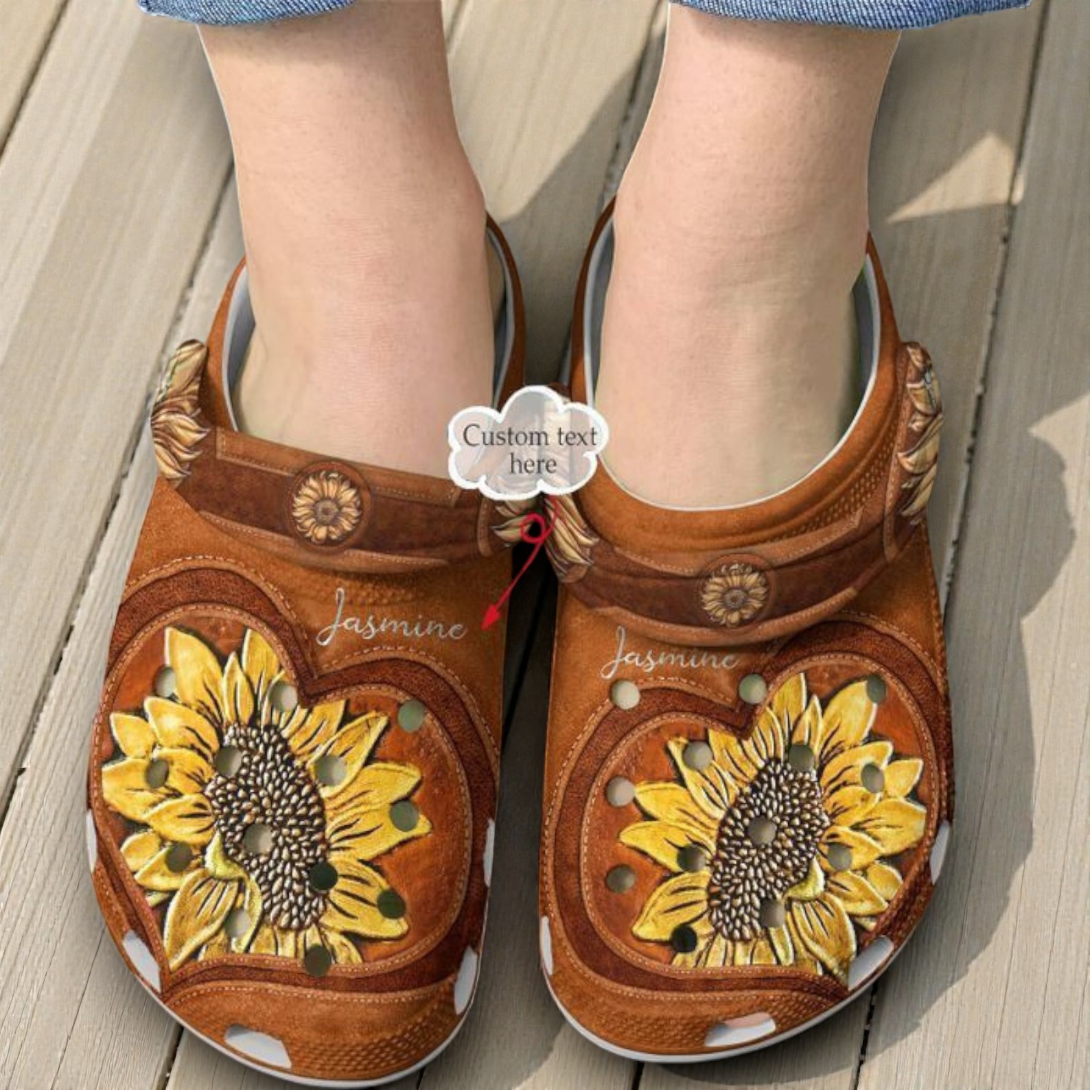 There’s something about the carefree energy of the 1960s that lingers in the best wardrobe choices—like those clogs that look like they belong on a sun-dappled porch during a summer afternoon. These shoes carry that vibe effortlessly, wrapped in a rich, suede-like brown texture that feels as natural as worn-in leather. Sunflowers bloom boldly across the surface, their bright petals outlined with playful, decorative stitching that hints at handcrafted detail. The cursive text on the strap adds a personalized touch, the kind of handwriting that feels handwritten, warm, and spontaneous. These aren’t just shoes; they’re an expression—a way for free spirits to wear a bit of their soul on their feet. They fit seamlessly with flowy skirts, wide-brim hats, or faded denim, speaking to anyone who embraces a bohemian aesthetic without apology. Picture a friend who hosts backyard gatherings filled with laughter and folk music or someone who treasures thoughtful, handcrafted gifts that hold meaning beyond the usual. In casual settings, whether wandering market streets or lounging with friends by a campfire, these clogs become part of the story. The Hippie Personalized Spirit Flower Clog Shoes invite you to carry a bit of that bold but playful attitude wherever you go, perfectly at home with those who aren’t afraid to show their love for nature, art, and genuineness.