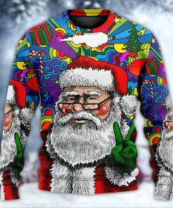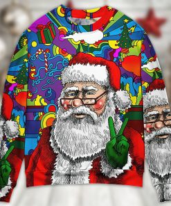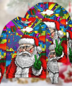 Get into the retro holiday spirit with this groovy sweater that captures the essence of a bygone era. This unique design embraces the iconic Hippie Santa Claus, a jolly figure with a festive tie-dye shirt and a peace sign tucked into his belt. The sweater combines the traditional Christmas theme with a touch of bohemian flair, making it a standout addition to any ugly sweater party or festive gathering. With its vibrant colors and playful imagery, this sweater is sure to bring smiles and spread peace, love, and joy throughout the holiday season.