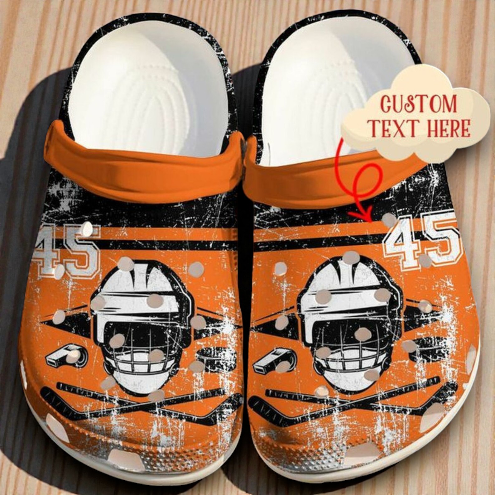 It’s the kind of slipper that immediately catches your eye—not just because it’s got the bold look of a sports helmet, but because it wears that look with an undeniable edge. The distressed texture gives it a lived-in feel, like it’s been part of some intense game days, while the racing stripes slice through the orange football helmet graphic with confident energy. The number 45 stands out crisp and clear, stamped in blocky, athletic font that you almost expect to see on a player’s jersey. There’s even a custom text badge, perfect for adding that personal touch, making these slippers anything but ordinary. These aren’t just for anyone. They speak to fans who don’t just watch sports but live them, those who appreciate a little grit and personality in their gear. If you love hockey or aren’t afraid to mix your sports fandoms, this design nails that bold, playful vibe without screaming for attention. It’s like showing off your team spirit quietly but unmistakably—right there on your feet. Whether you’re winding down after a game night or kicking back on a lazy weekend, these personalized slippers feel like a natural extension of your fan identity. Gifting something this unique to a lover who’s passionate about sports? It’s the kind of thoughtful surprise that hits the mark, blending comfort with undeniable style. The Hockey Personalized Helmet 102 Gift For Lover Classic Crocs makes chilling at home feel just a little more spirited.