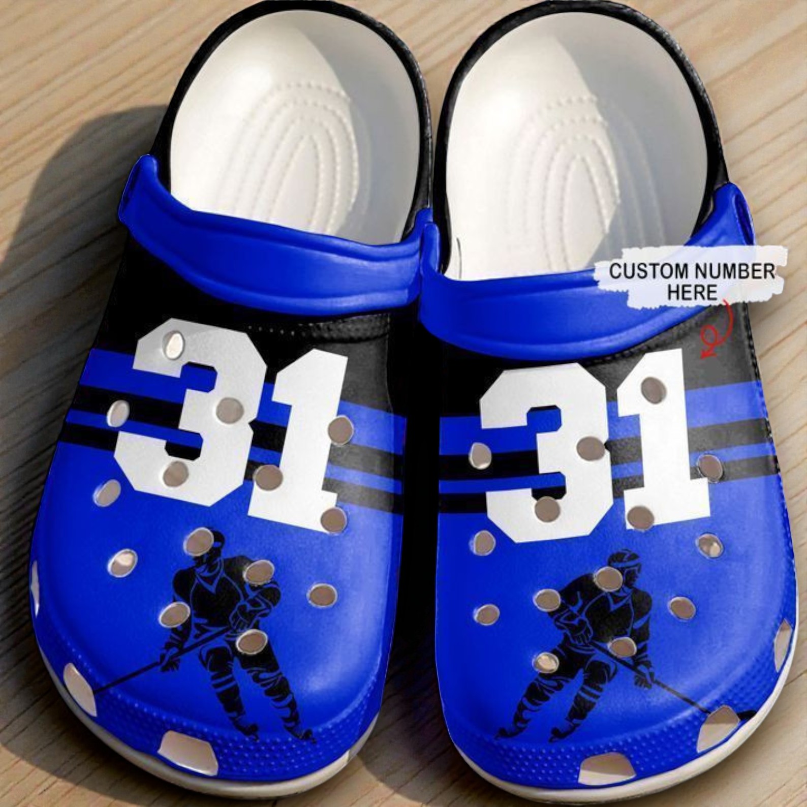 A sharp blue gradient fades across these clogs, like the chill of an early-morning rink where the ice still gleams under harsh lights. Bold white block numbers declare your presence—number 31 stands proud, framed by black stripes that echo the fierce lines of a hockey jersey. A sleek silhouette of a hockey player in mid-stride captures the game’s relentless motion, frozen in the midst of a powerful shot. The classic hole punches, not just decorative but a nod to lacing patterns on real hockey gear, tie the whole athletic vibe together. These shoes don’t just carry you; they speak for the grit and passion shared by anyone who’s ever hustled on ice or cheered from stands. There’s a connection here, a kind of unspoken language among hockey players and fans who know what it means to wear your number like a badge of pride, to live and breathe the game’s competitive energy. The custom number isn’t just personalization—it’s a way to stake your claim in this community. Whether tucked under a locker room bench or paired with a favorite jersey on casual game day, these hockey personalized custom number clogs fit effortlessly into the lifestyle of players and supporters alike. They make for a thoughtful gift that resonates far beyond aesthetics—a keepsake for someone whose world revolves around the fast, gritty, and exhilarating culture of hockey.