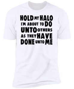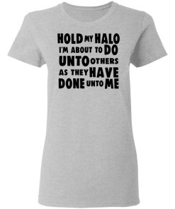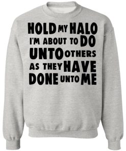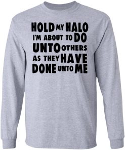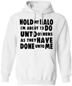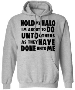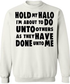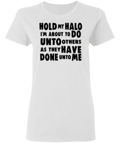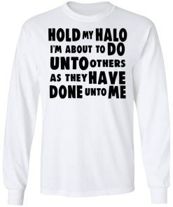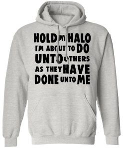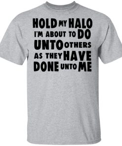 Hold My Halo I’m About To Do Unto Others As They Have Done Unto Me shirt. Available in t shirt, long sleeve, tank top, hoodie, sweatshirt and multiple color. If you want in another color please contact us. Quality control before delivery. Print: Digital printing, colors won’t fade or peel. The design is printed with new age printing technology. It is printed with a water – soluble and eco – friendly ink. Treat yourself, or make this shirt the perfect gift on birthdays, anniversaries, holidays, or give a gift to friend, yourself, or family, or for no reason at all.