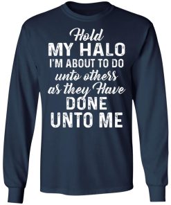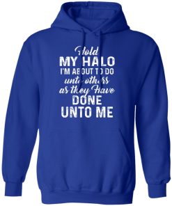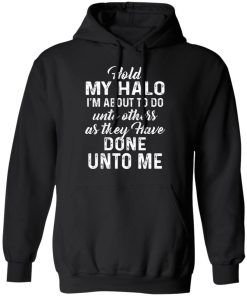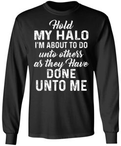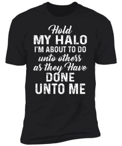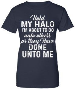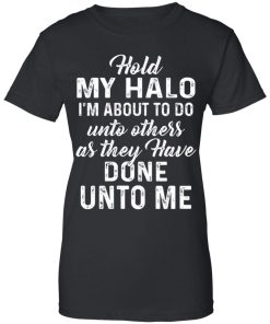 Hold my halo I’m about to do unto others as they have done unto me shirt. Buy it now, from $19.99 and $3.99 shipping. This shirt available in t shirt, long sleeve, hoodie and multiple color.