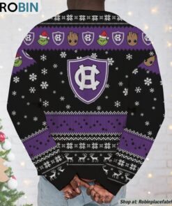 Are you ready to celebrate the holiday season with a twist of pop culture and team spirit? Introducing the most charming and delightfully mismatched duo to grace your festive wardrobe. Featuring the lovable Baby Groot and the mischievous Grinch, this unique sweatshirt effortlessly combines beloved characters with the proud, spirited colors of the Holy Cross Crusaders. Perfect for adding a whimsical touch to your holiday gatherings, and sure to be a conversation starter at any ugly sweater party, this cozy and eye-catching piece is a must-have for fans and alumni alike. Don't miss out on spreading some holiday cheer with a dose of fun and fandom!