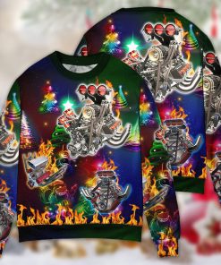 The Hot Rod Christmas Tree Fire Christmas Ugly Sweater Sweatshirt is a quirky and festive addition to the holiday season. This unique sweatshirt showcases a hot rod car with flames shooting out from its exhaust pipes, engulfing a Christmas tree in a fiery blaze. The playful design is sure to stand out at any holiday gathering and is perfect for those who like to add a touch of humor to their winter wardrobe. Made from comfortable and cozy materials, this sweater is perfect for keeping warm on chilly winter nights. It’s a fun and festive way to celebrate the holiday season with a touch of irreverent style.