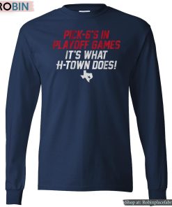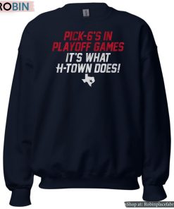 The Houston Pick 6s in Playoff Games shirt is a sports-themed apparel that pays homage to the Houston Texans’ defense powering through the playoffs. The shirt features vibrant colors and bold designs that showcase the team’s highlights. It serves as a proud statement piece for fans to show their support for the team and relive memorable moments on the field. Sports enthusiasts can wear this shirt to celebrate the Houston Texans’ triumphs and victories during playoff games.
