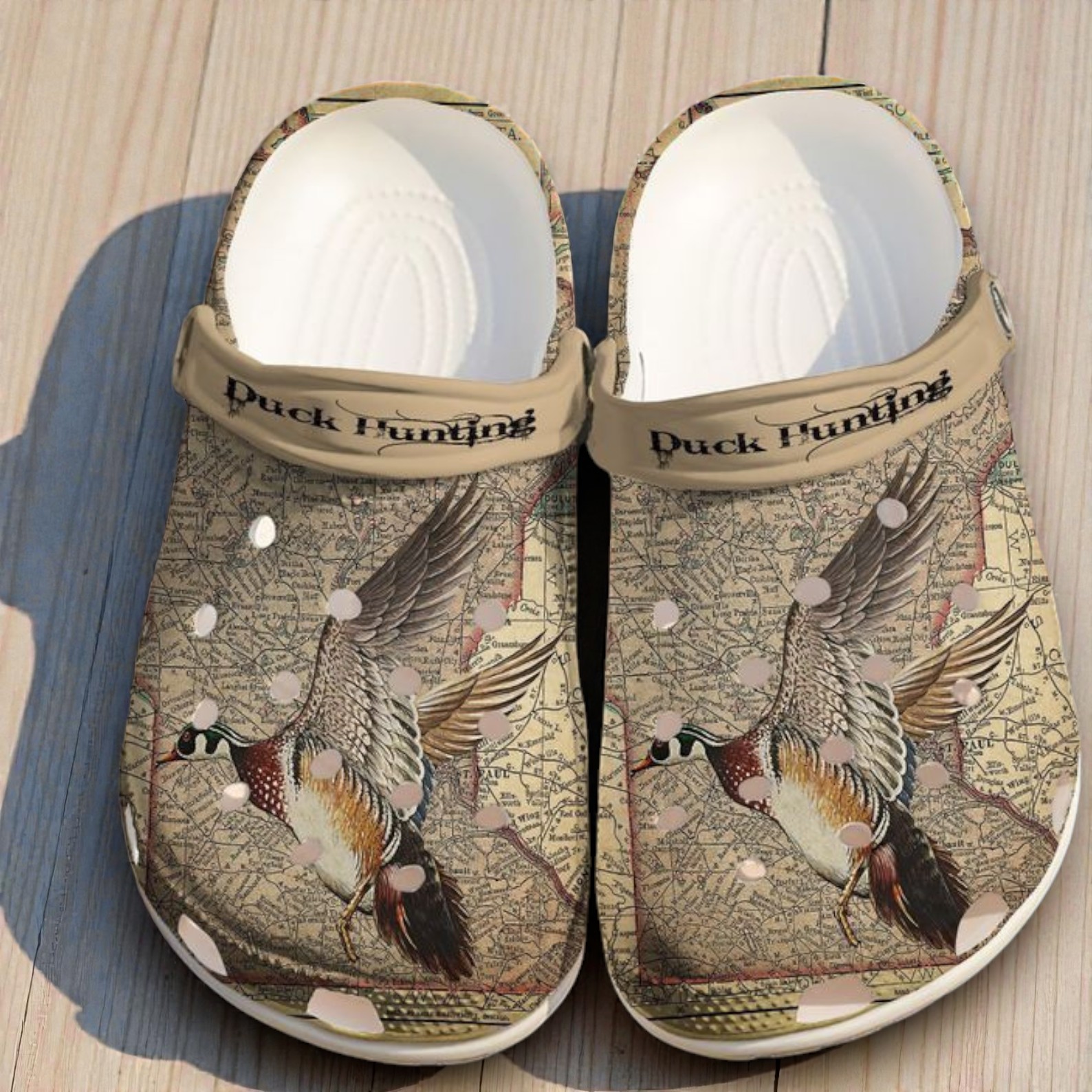 Get ready for duck season with these comfortable Crocs. They showcase a unique map print and a flying duck graphic that really stands out against the neutral tan color.