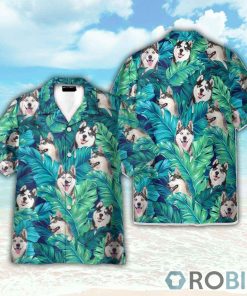 Husky In Tropical Green Leaves Hawaiian Shirt features
