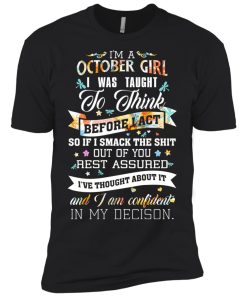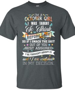 I am a October girl I was taught to think before I act t shirt, tank top, hoodie, long sleeve available