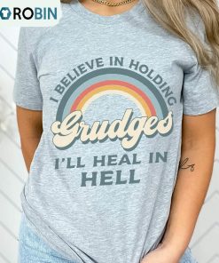 This I Believe In Holding Grudges Ill Heal In Hell Vintage Design Short Sleeve Sweatshirt is a wonderfully stylish addition to any wardrobe. The sweatshirt features a bold statement in a vintage-inspired font on a classic black background. The short-sleeved design is comfortable and stylish, and the print design means that it’s perfect for making a statement. The whiteshirt is made of soft and breathable material, allowing for maximum comfort while keeping you feeling stylish. The perfect wardrobe essential for anyone who believes in forgiveness, this sweatshirt is ideal for any occasion. With its unique design, this stunning sweatshirt is sure to turn heads.