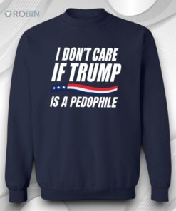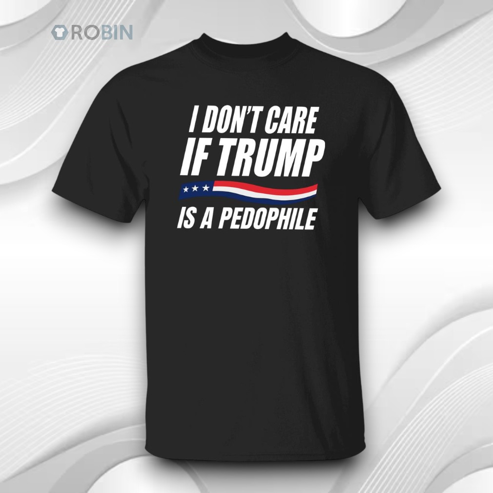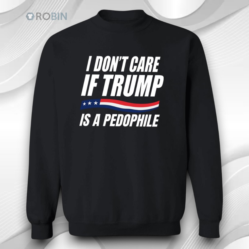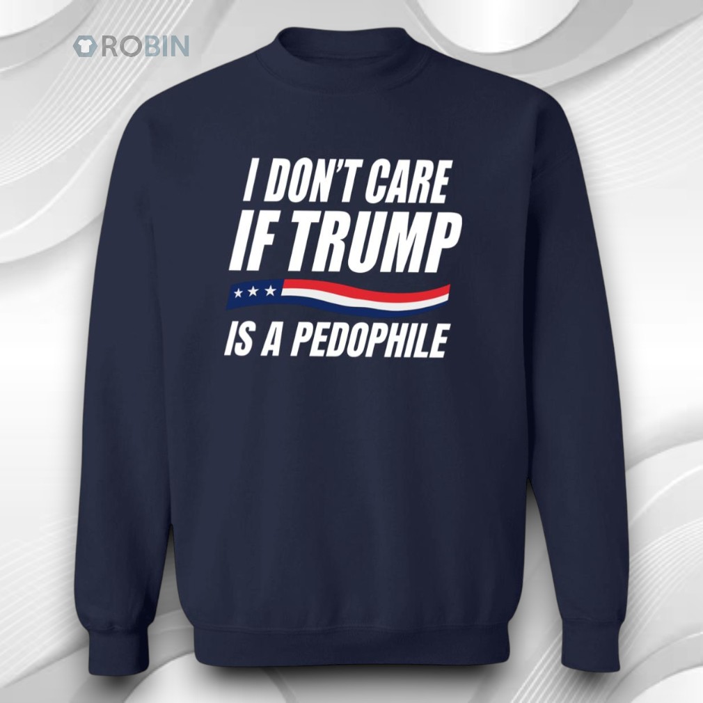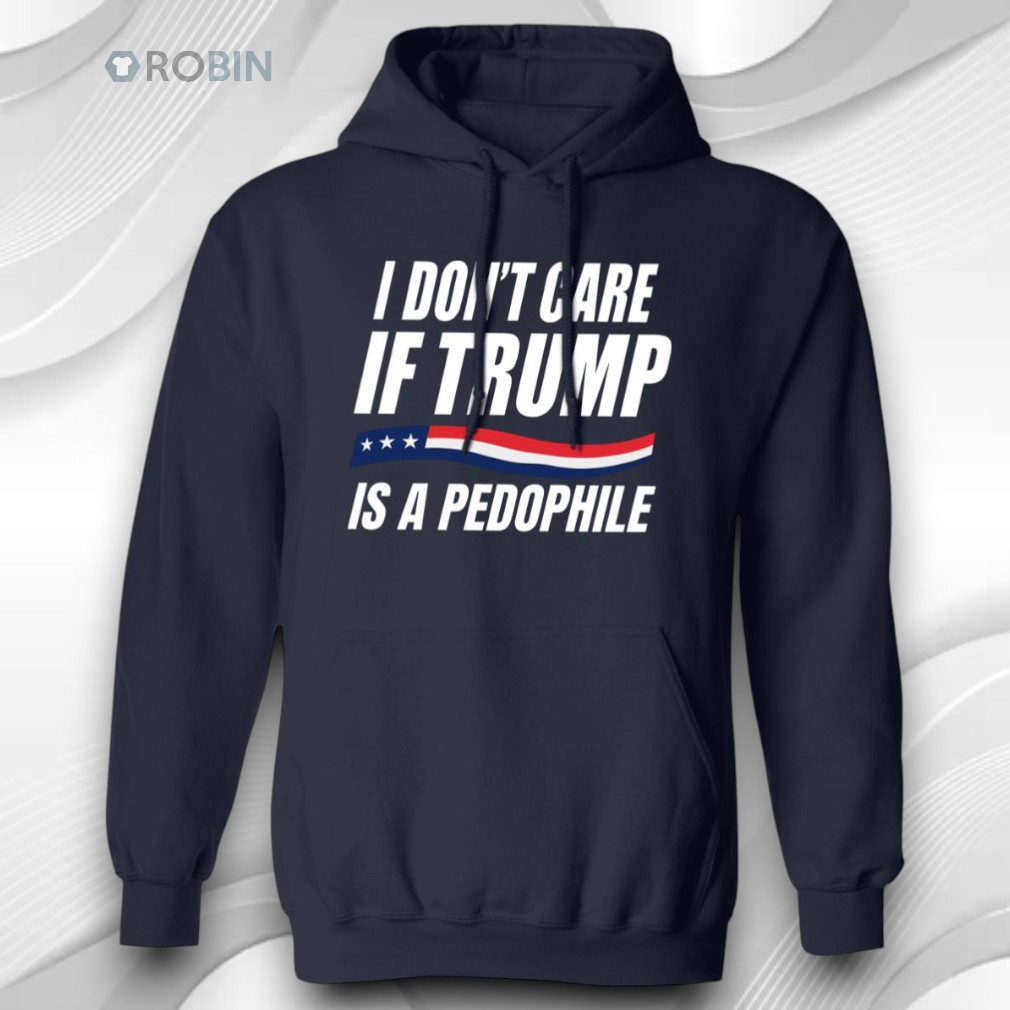 A navy hoodie stretches across the frame, its clean lines and relaxed fit setting a casual yet assertive tone. Across the chest, bold white letters slash through the fabric in a condensed sans-serif typeface, each uppercase word striking with unapologetic clarity: I DON’T CARE IF TRUMP IS A PEDOPHILE. Beneath the text, a stripe blending red, white, and blue unfurls like a defiant banner — stars peppered like sharp punctuation along the band. The simplicity of the design contrasts with its confrontational message, creating a visual tension that's impossible to ignore. Wearing this hoodie reads like a statement from someone who embraces boldness as a form of self-expression. It’s for the individual who navigates political discourse not with hesitation but with a willingness to provoke, challenge, or simply announce what others might shy away from. Paired with worn-in jeans or layered under a messenger jacket, it becomes part of an everyday look shaped by authenticity rather than approval. Not everyone would reach for something so clearly provocative — that’s the point. It belongs to those who find strength in their convictions and who understand that clothing can be a canvas for identity and perspective, merging personal beliefs with public display. Whether worn during a gathering where politics swirl in the air or thrown on for errands with a hint of edge, this hoodie carries a message as much as a mood.
