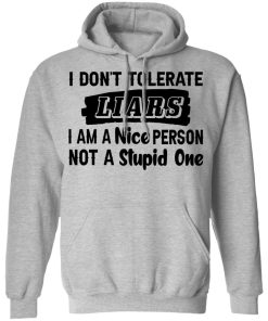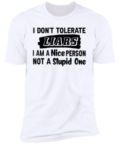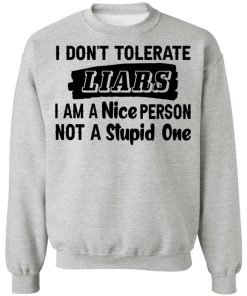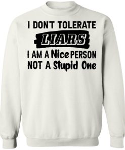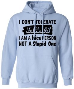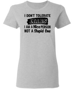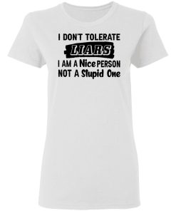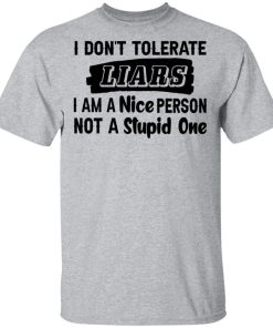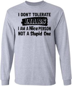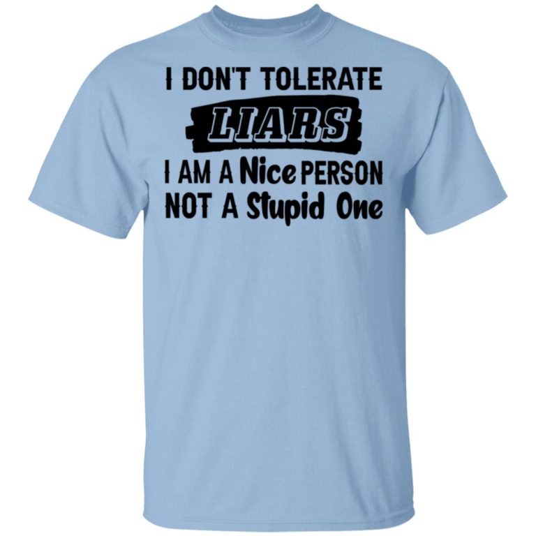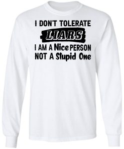 I Don’t Tolerate Liars I Am A Nice Person Not A Stupid One shirt. Available in t shirt, long sleeve, tank top, hoodie, sweatshirt and multiple color. If you want in another color please contact us. Quality control before delivery. Print: Digital printing, colors won’t fade or peel. The design is printed with new age printing technology. It is printed with a water – soluble and eco – friendly ink. Treat yourself, or make this shirt the perfect gift on birthdays, anniversaries, holidays, or give a gift to friend, yourself, or family, or for no reason at all.