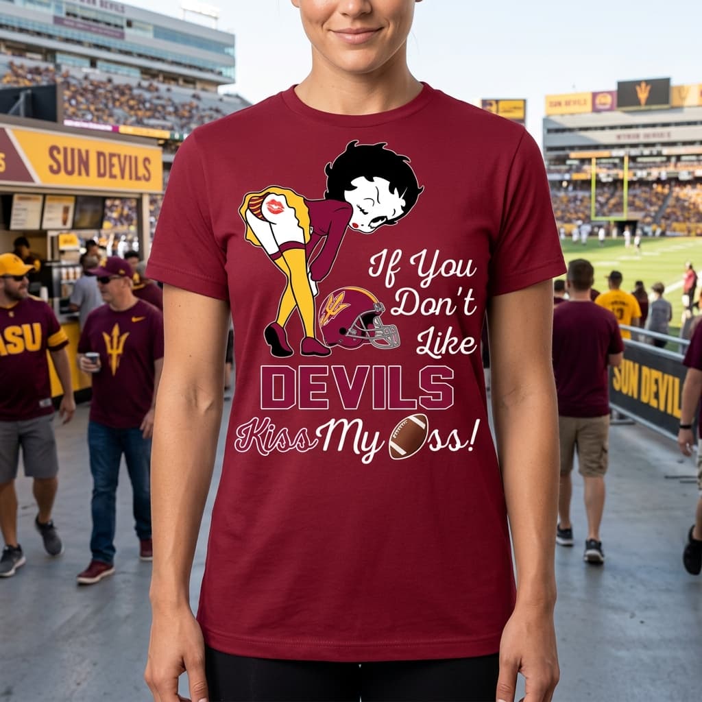 There’s a certain charm in apparel that doesn’t just show team pride but says it loud and clear with a no-nonsense attitude. This shirt embraces that spirit fully, radiating a rebellious energy that fits right into spirited game-day atmospheres. The deep maroon backdrop sets an intense stage for the vivid illustration of a woman striking a confident pose in bright yellow stockings—a playful nod to boldness without holding back. The football helmet nearby anchors the design firmly in the world of college sports, while the large, mixed-font text delivers the message with cheeky aggression. The combination of script and block uppercase fonts creates a visual tension that feels both vintage and fresh, mirroring the confident defiance in the phrase “Devils Kiss My Ass.” This shirt doesn’t just hang quietly in the closet; it says something about the wearer—a fan who’s unapologetically devoted to the Sun Devils, someone who blends a sharp sense of humor with fierce loyalty. Pairing it with casual denim or sporty joggers keeps the look laid-back but striking enough for tailgating or hanging out with fellow fans. This tee is naturally for anyone who thrives on bold statements—whether buying for themselves or as a gift for that friend who’s always the loudest and proudest in the crowd. It fits seamlessly into the kind of lifestyle where fashion meets fandom with a side of cheeky irreverence.