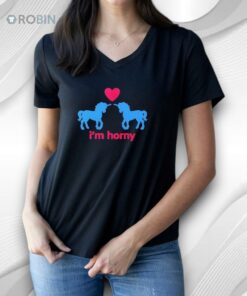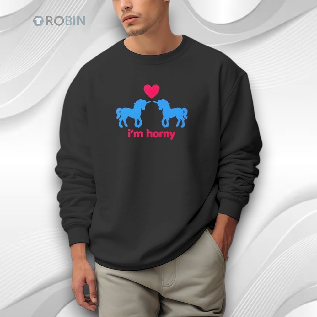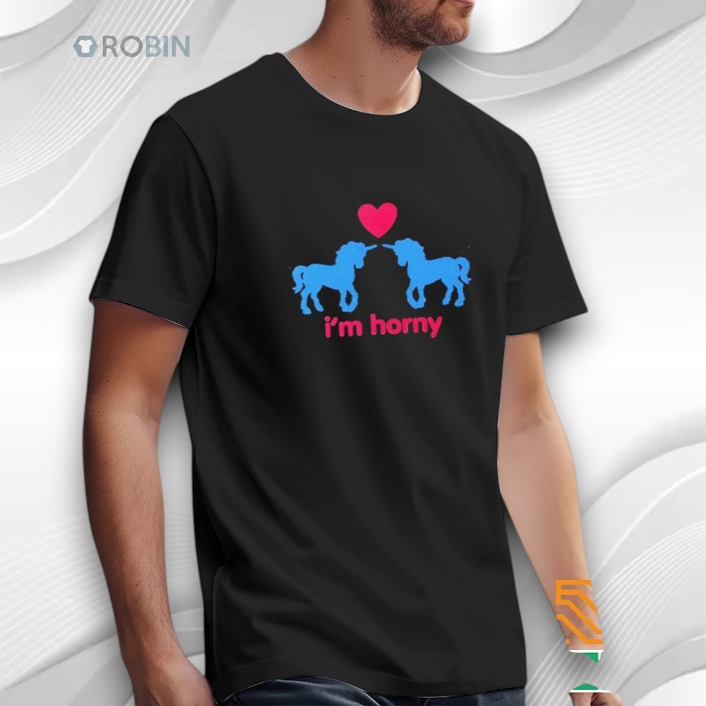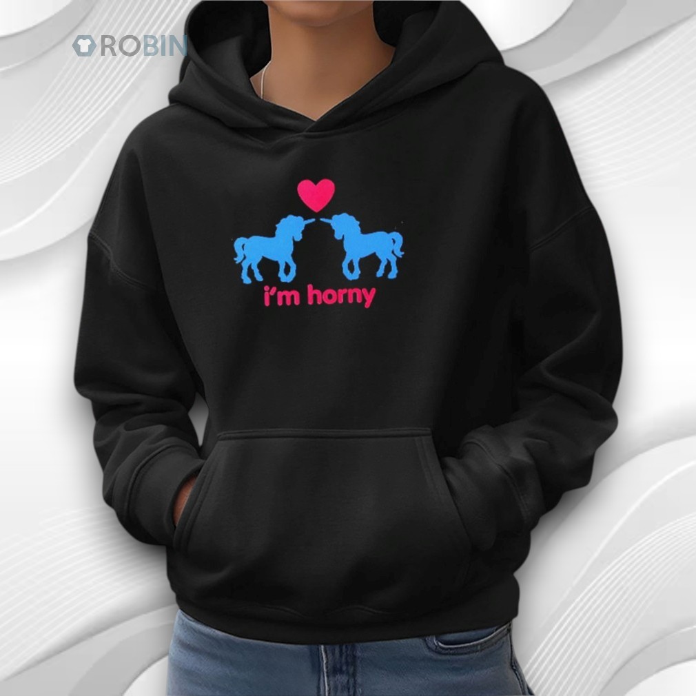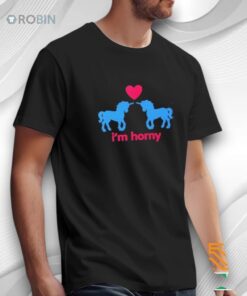Playful, cheeky, and unapologetically suggestive — this graphic apparel is all about bold humor and flirty energy. The design features two cute unicorn silhouettes facing each other beneath a heart, paired with the blunt caption “I’m horny”. Simple visuals, clear message, zero subtlety.