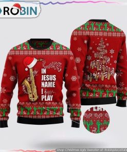 In Jesus Name I Play Saxophone Ugly Christmas Sweater Gifts For Christians