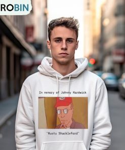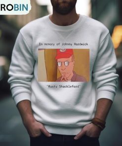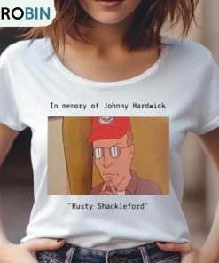 The In Memory Of Johnny Hardwick Rusty Shackleford shirt is a tribute to a beloved character from the popular animated show King of the Hill. Johnny Hardwick provided the voice for the enigma that is Rusty Shackleford, a character known for his wild conspiracy theories. This shirt serves as a memorial to both the actor and the character he brought to life, honoring the humor and wit they brought to the show. Fans of the show can proudly wear this shirt to show their appreciation for the comedic brilliance of Johnny Hardwick and his iconic character.