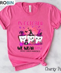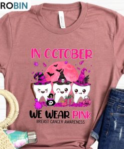The In October We Wear Pink Breast Cancer Shirt is a fashionable and meaningful way to show support for Breast Cancer Awareness. This shirt features a Halloween-themed design, making it perfect for wearing during the month of October. It is made of high-quality materials and comes in a long sleeve style, making it suitable for cooler weather. Whether you are a cancer survivor, know someone who has been affected by breast cancer, or simply want to raise awareness, this shirt is a great choice. Wear it proudly and help spread awareness during Breast Cancer Awareness Month.