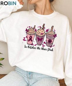 In October We Wear Pink Coffee Shirt, Cancer Support Unisex T-shirt Crewneck details