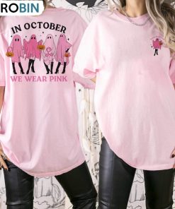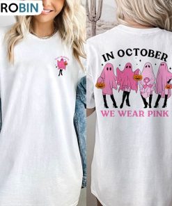 The In October We Wear Pink Ghost Funny Shirt Cancer Halloween Crewneck Sweatshirt is a unique and eye-catching garment that combines two important themes – breast cancer awareness and Halloween. This crewneck sweatshirt is printed with a cute pink ghost design to represent breast cancer awareness month, and features a funny slogan that highlights the importance of wearing pink in October. Made from comfortable and warm materials, this sweatshirt will keep you cozy and stylish while showing your support for a great cause.