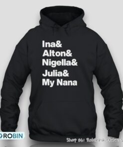 Introducing this unisex shirt that brings together icons from the culinary world and a personal touch with My Nana. This shirt not only celebrates the culinary talents of Ina, Alton, Nigella, and Julia but also pays tribute to the beloved family member who inspired your love for cooking. With a unique design that combines all these elements, this shirt is a must-have for any food lover or fan of these renowned chefs. Add a touch of nostalgia and style to your wardrobe with this special shirt that will surely spark conversations and memories.
