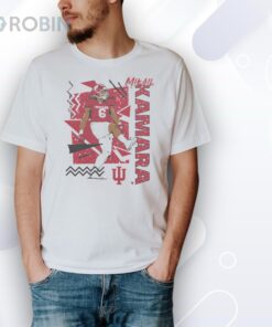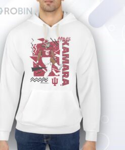 Dive into the nostalgia of the 90s with this bold, retro-inspired design. Featuring dynamic graphics and vibrant colors, it captures the spirit of Indiana football. The blend of abstract patterns and prominent text adds a playful yet powerful touch to this tribute to Mikail Kamara. Perfect for fans who love a vintage vibe with a modern twist.