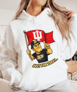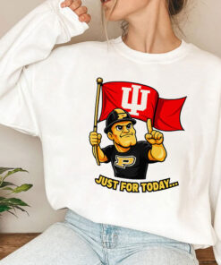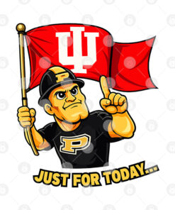 a Purdue-style mascot vibe, a big waving IU flag, and the line “JUST FOR TODAY…” like you’re making a