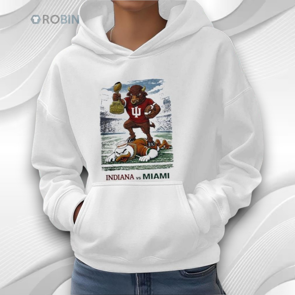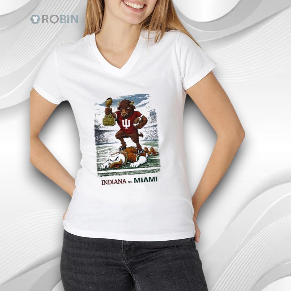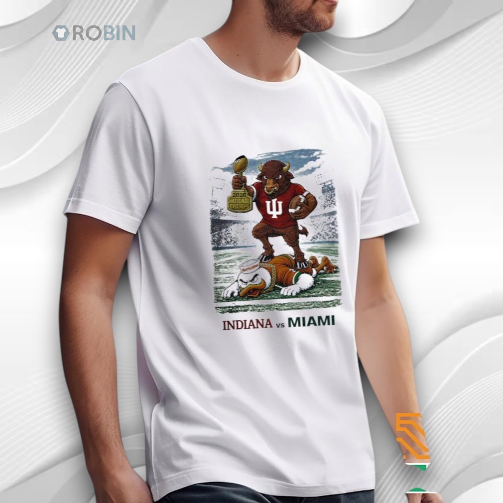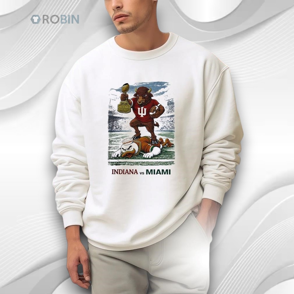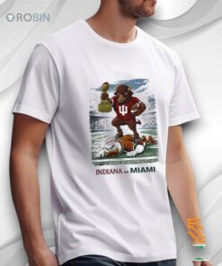 Bold, dominant, and pure championship energy — this graphic apparel captures a legendary Indiana vs Miami showdown in unforgettable fashion. The design features a powerful Indiana mascot standing tall on the field, football in hand, celebrating victory while asserting dominance over Miami in a dramatic, old-school sports illustration style. It’s fearless, competitive, and built for fans who love rivalry moments.