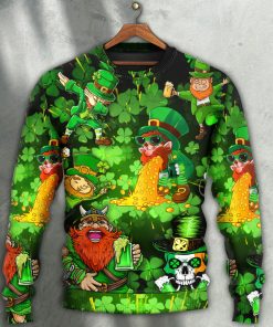 Get ready to celebrate all your favorite holidays with this unique and festive sweatshirt! Perfect for St. Patrick’s Day, Christmas, or any Viking-themed event, this sweatshirt is sure to be a hit. Featuring a skull-wearing Viking helmet, a mischievous leprechaun, and a friendly gnome, this sweater is brimming with holiday spirit. The design is made even more eye-catching with its bold colors and intricate details. Made from comfortable and cozy fabric, this ugly sweater comes with a ribbed collar, cuffs, and hem for a perfect fit. Stand out at any holiday party with this one-of-a-kind sweater!