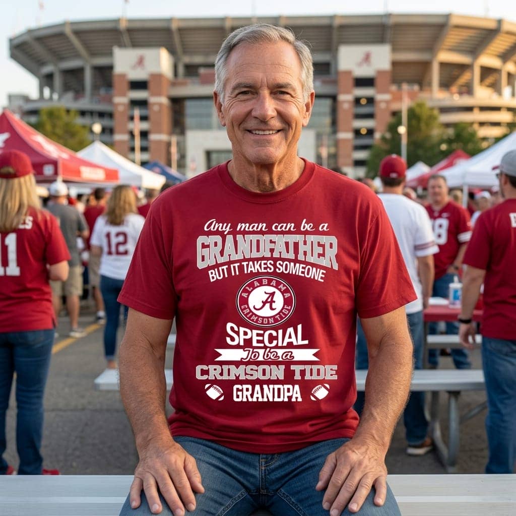 The deep crimson backdrop hits just right, bold and unmistakable, with strong block letters declaring allegiance in all caps—a proud shout that feels like it was made to be seen from the stands. Nestled within the circular logo, a classic script swirls gently beneath the banner, softening the bold type and adding a touch of warmth. It’s the kind of design that celebrates more than just a team; it honors a legacy, a lineage carried proudly from one generation to the next. This shirt speaks directly to that grandpa who’s been cheering from the sidelines long before most knew what college football even was. The bold, round logo isn’t just a graphic—it’s a statement of identity, a badge of honor for anyone who’s earned the nickname crimson tide grandpa. Whether he's tailgating at a game or sharing stories with grandkids about old seasons, this t-shirt fits right in with the everyday rituals of fan life. It makes a meaningful gift, too, especially for Father’s Day or game day gatherings when family laughter and team spirit fill the air. It’s not about flashy trends or fleeting styles, but about a connection—between a grandpa, his family, and the team that’s woven into their story. For any Alabama Crimson Tide fan, this is a way to wear pride not just on the chest, but in the heart.
