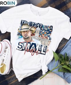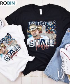 The Jason Aldean Small Town Retro Shirt Jason Aldean Band Patriotic Hoodie is a great hoodie for fans of the popular country music artist. The hoodie is a navy blue color with a bright American flag on the back. The front features a retro-style Jason Aldean logo in a modern font. The hoodie is made from a comfortable cotton blend that provide warmth throughout the winter months. Enjoy wearing this hoodie while you cheer on your favorite artist from concerts or just your everyday activities.