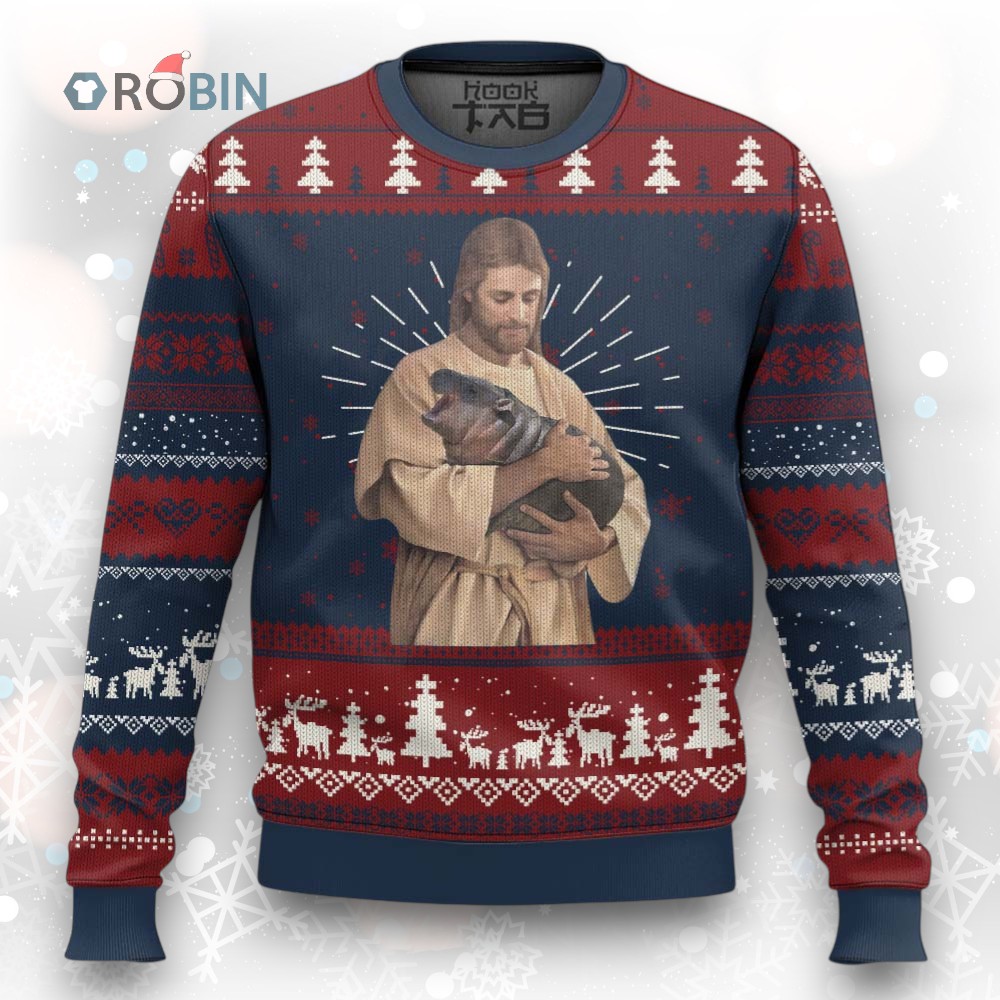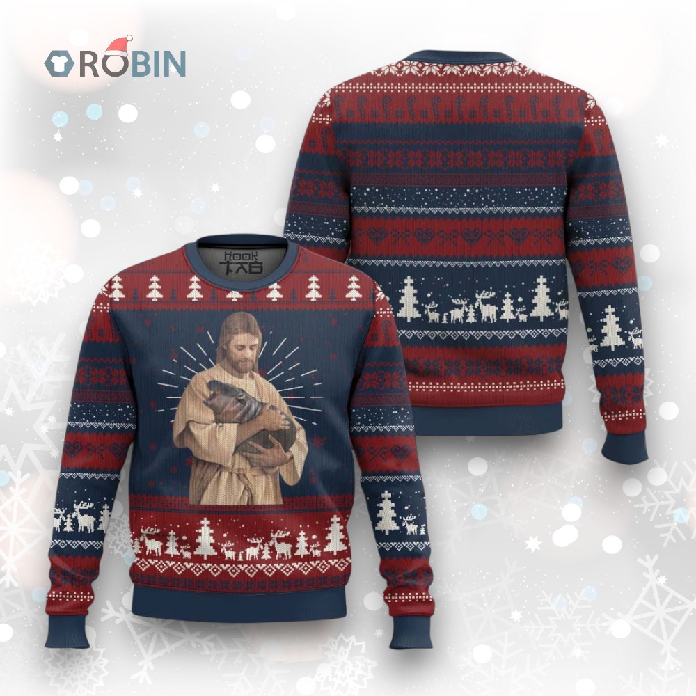 Spread holiday cheer with this uniquely quirky sweater! Featuring a bouncy pig, adorable pygmy hippo, and a whole lot of meme-worthy goodness. It's ugly sweater season, and this one's a guaranteed conversation starter! Get yours today and make spirits bright! 🐷🦛🎄