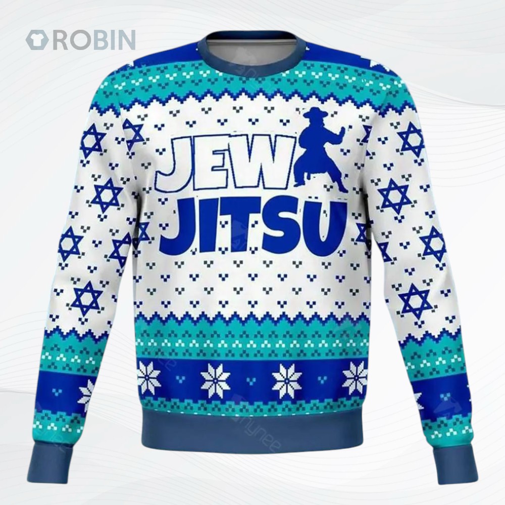 Ever seen a sweater that makes you grin and start a conversation? This design brings a playful twist to the holiday season with a fun, spirited nod to martial arts and Jewish culture. Wrapped in traditional festive patterns, it’s a delightful mix of humor and heritage. Ready to spread some joy and laughter this season? Grab yours now and let the festivities begin!