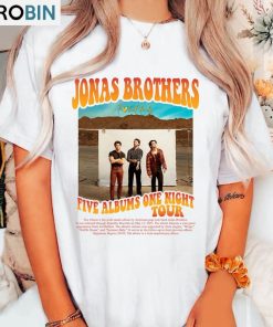 The Jonas Brothers Shirt Vintage Five Albums One Night Tour Long Sleeve Unisex Tshirt is a must-have for any true fan of the iconic pop band. This vintage-inspired shirt features the names of the brothers' five albums and the phrase One Night Tour printed on the front. Made from comfortable and durable materials, this long sleeve t-shirt is perfect for everyday wear or for attending a Jonas Brothers concert. With its unisex design, anyone can show off their love for the band in style.