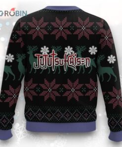 Get into the festive spirit with this unique design featuring Satoru Gojo in a playful pose, perfect for anime fans looking to add a humorous twist to their holiday attire. Snowflakes and reindeer enhance the quirky charm, creating a fun, standout piece for any Jujutsu Kaisen enthusiast.