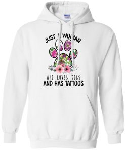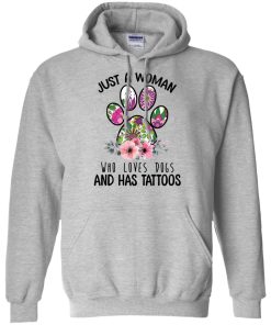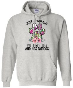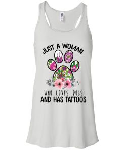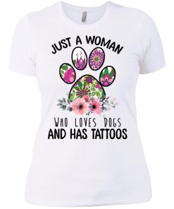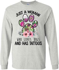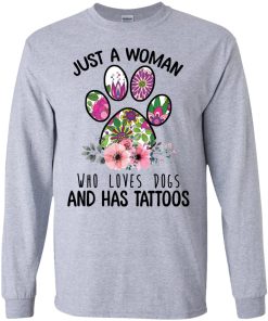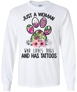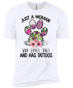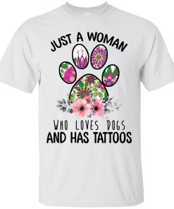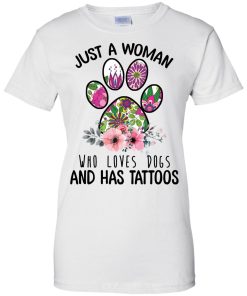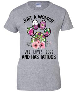 Just a woman who loves dogs and has tattoos t shirt, tank, hoodie, long sleeve available